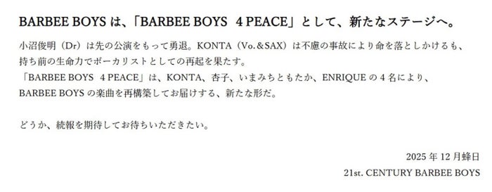 その後KONTAの公式サイトが更新され、KONTAは事故により「肩から上しか使い物にならない」という現在の状態を説明。「『BARBEE BOYS 4PEACE』では、サックスこそ吹けないが、おれの変わり果てた姿と変わらぬふてぶてしさをお楽しみいただくため、もっか錬成の日々である」とコメントしている。