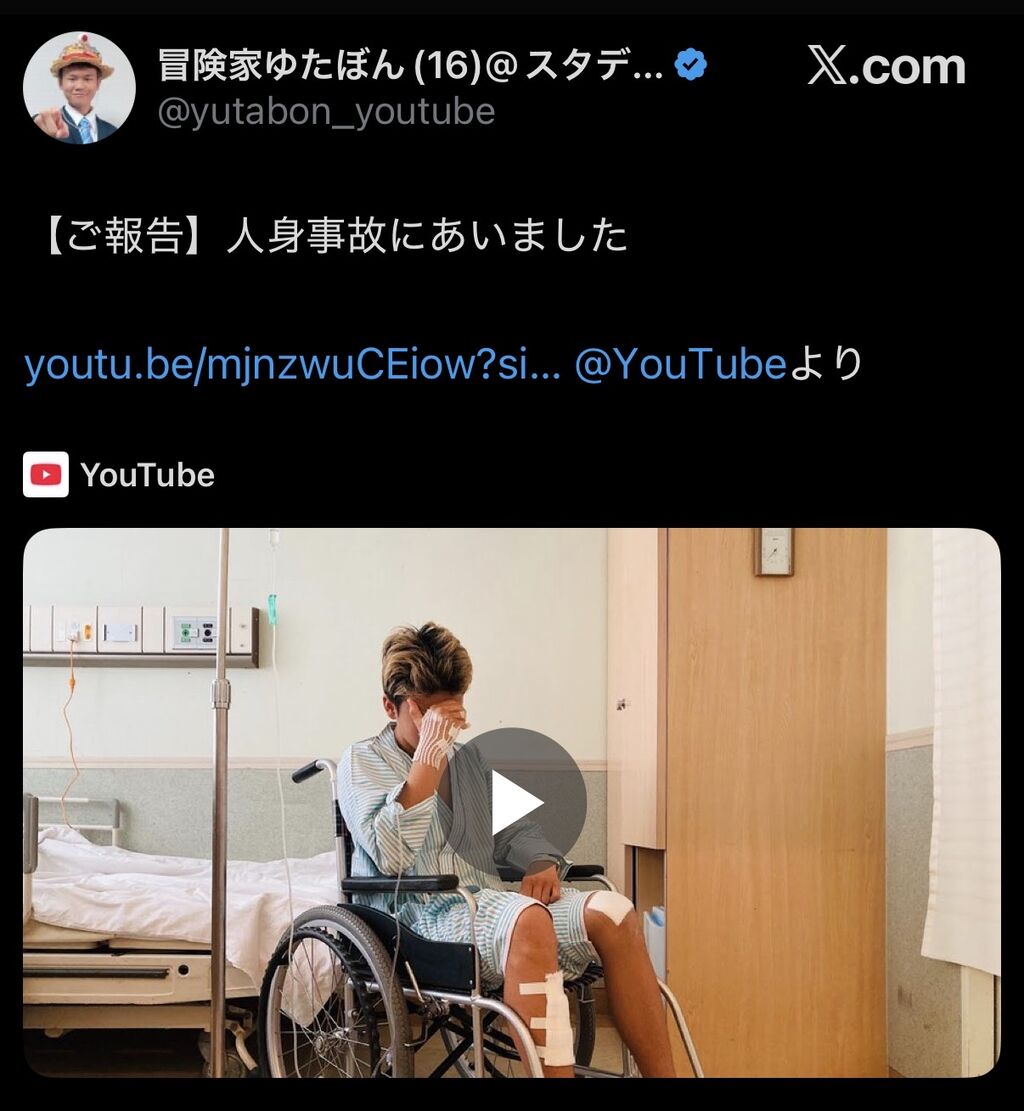 その後、救急車で搬送され、入院したゆたぼん。病床では、「頭も痛くて、首も腰も腕も」と包帯で巻かれた腕をかざした。ヒザやすねも「今もまだ痛い。いたたた…」とまだ全身が痛い状態という。
