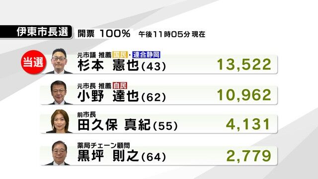 学歴詐称問題に端を発して、前市長が失職したことにともない行われた伊東市長選は、当事者である前市長の田久保眞紀 氏が落選し、元市議の杉本憲也 氏が初当選を果たした。