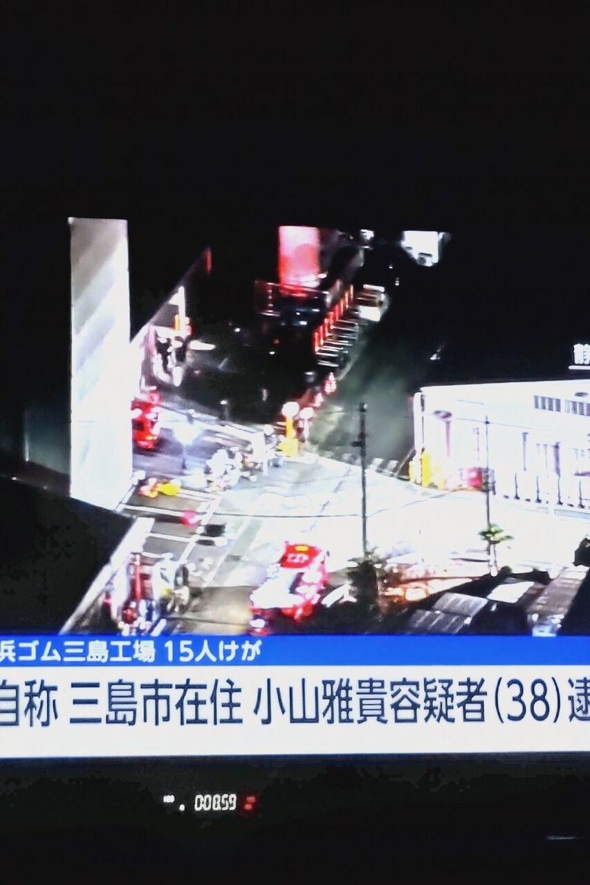 横浜ゴム三島工場で、ガスマスクを着用した男が刃物で15人を刺し、液体を撒く事件が発生。負傷者の回復を祈ります。