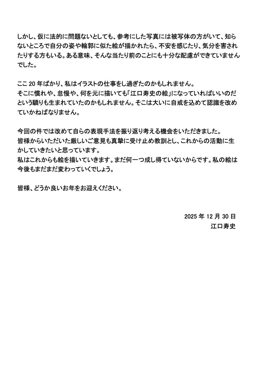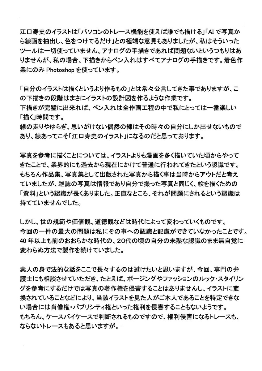 江口寿史氏の謝罪文、遅くなった分だけ真摯に感じます。
