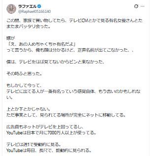 ラファエルは、家族と一緒に外出中に有名女優と遭遇した出来事について書き出し、「嫁が『え、あの人めちゃくちゃ有名だよ』って言うから、俺も顔は分かるけど、正直名前が出てこなかった、、僕は、テレビをほぼ見てないからピンと来なかった、その時ふと思った。もしかして今って、テレビに出てる人が一番有名っていう感覚自体、もう古いのかもしれない」と言及。「上とか下とかじゃない。ただ事実として、見られてる場所が完全にネットに移動してる」と指摘した。