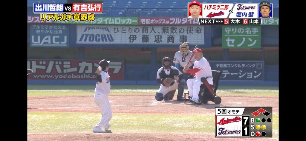 なお、試合は予定の5回を終了して「アリヨシズ」が8―4で勝利。出川が土下座して“泣きの1回”が追加されたが、結局6回を終えても8―4とスコアは変わらずに今度こそ本当に試合終了し、127球で完投勝利した有吉がMVPに選ばれている。