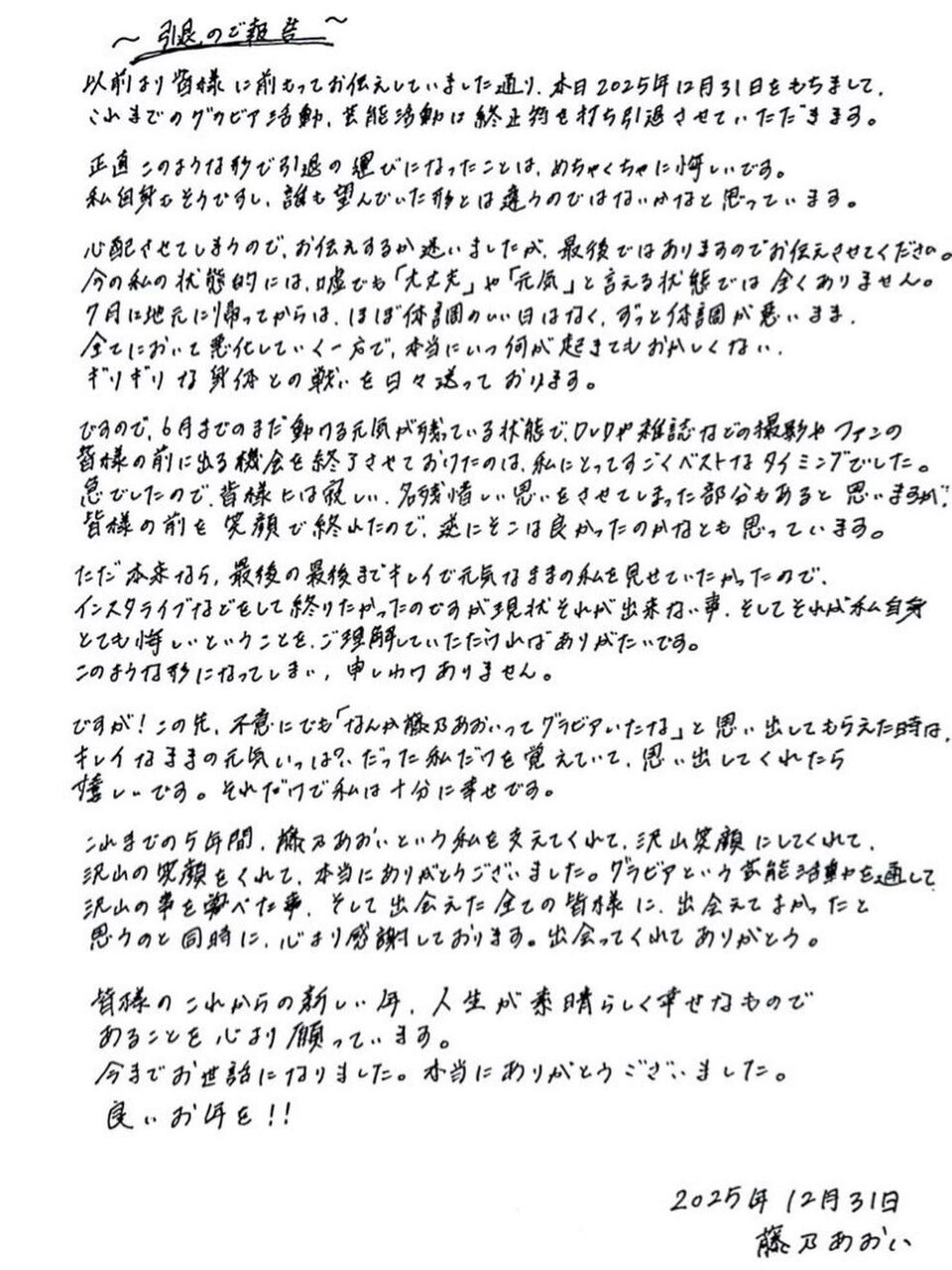 また、昨年大みそかにはSNSに直筆のメッセージを掲載し、芸能界引退を報告。体調不良が続いていることを明かしながらも、「出会ってくれてありがとう」とファンや関係者への感謝を記していた。