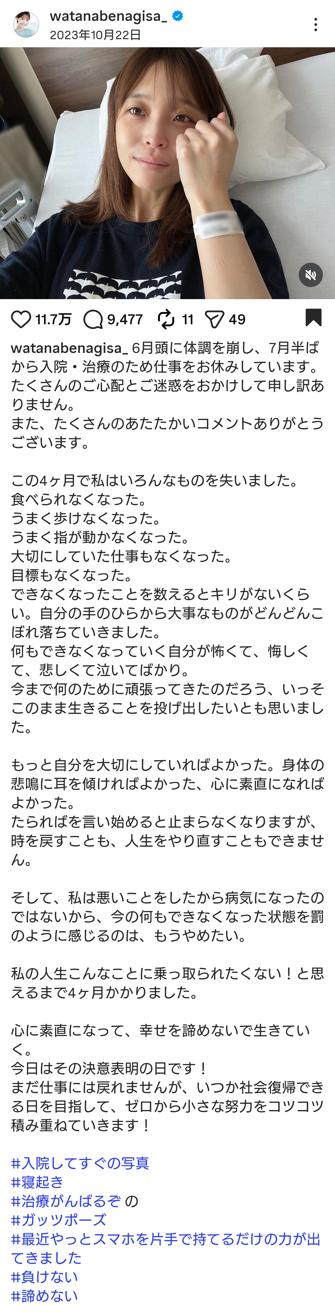 病院でCT検査を受けたことをインスタグラムで報告。「造影剤を点滴すると、身体中が、身体の中から燃える様に熱くなり息苦しくなる」「終わった瞬間の脱力感で、身体が全く動かなくなり車椅子で運ばれ、しばらく寝ていたそうです」と検査後の状況を説明し、ベッドで横たわる姿を披露。「意識はうっすらありましたが、前回も、同じ様な事が起こっていました」と続けている。