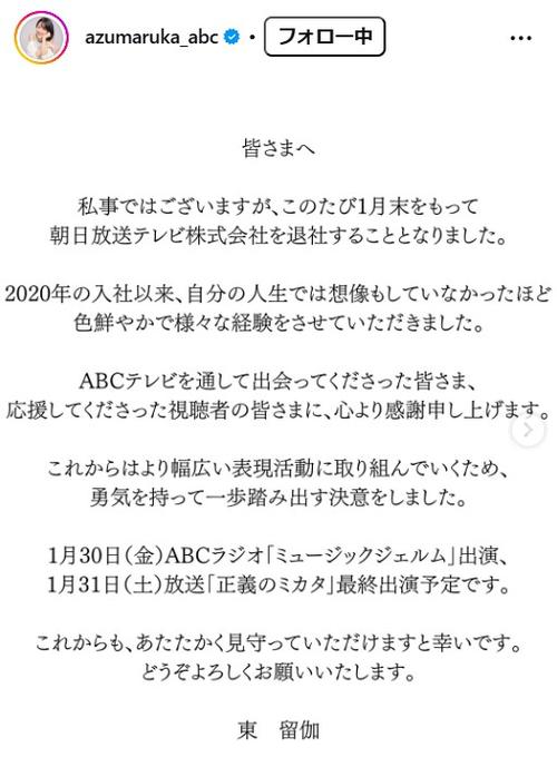 | ABC・東留伽アナ、1月末での退社を報告「勇気を持って一歩踏み出す決意をしました」 2020年入社…『旅サラダ』などに出演 …31日が最終出演予定 ABCテレビの東留伽アナウンサーが26日、自身のインスタグラムで1月末で退社することを報告した。 東アナは「【ご報告】」と切… (出典:ENCOUNT) |
