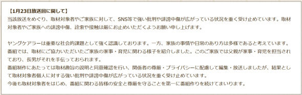 出演した家族は、放送をきっかけに誹謗中傷にさらされており、「日常生活もままならない現状」だという。これ以上の中傷や詮索は「厳にお控えいただきたい」と訴えている。