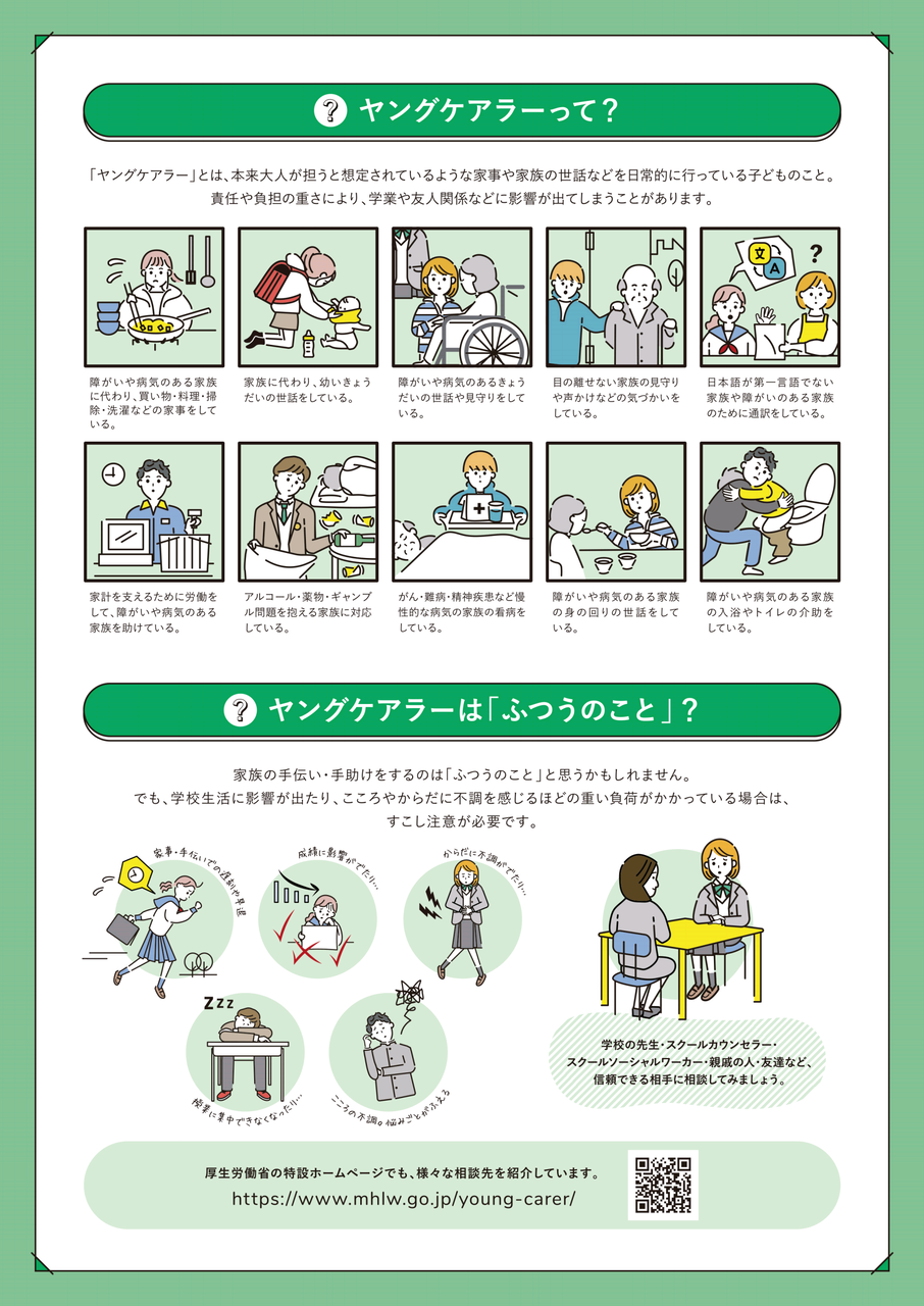 | ヤングケアラー(英: young carer)とは、病気や障害のある家族・親族の介護などで忙しく、本来受けるべき教育を受けられなかったり、同世代との人間関係を満足に構築出来なかったりする未成年、または未成年時代にそのような状況にあった人たちのこと。兄弟姉妹が障害児な場合はきょうだい児と呼ばれ、ヤン… 47キロバイト (5,638 語) - 2025年10月30日 (木) 12:28 |