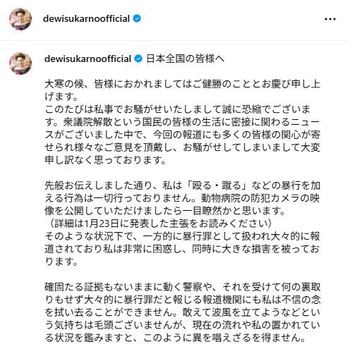 デヴィ夫人は「このたびは私事でお騒がせいたしまして誠に恐縮でございます。衆議院解散という国民の皆様の生活に密接に関わるニュースがございました中で、今回の報道にも多くの皆様の関心が寄せられ様々なご意見を頂戴し、お騒がせしてしまいまして大変申し訳なく思っております」と言及。「先般お伝えしました通り、私は『殴る・蹴る』などの暴行を加える行為は一切行っておりません。動物病院の防犯カメラの映像を公開していただけましたら一目瞭然かと思います。(詳細は1月23日に発表した主張をお読みください)」と否定した。