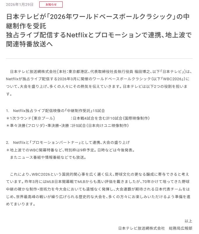日本テレビは29日、Netflixが独占ライブ配信する3月開催のワールドベースボールクラシック(以下「WBC2026」)について同社と「プロモーションパートナー」として連携、独占ライブ配信映像15試合の「中継制作」を受託し、開幕特番を放送すると発表した。
