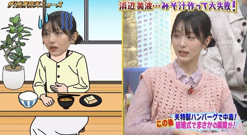 浜辺美波ちゃんが「ザ!世界仰天ニュース」で衝撃告白!お味噌汁大好きで深夜に作っちゃうけど、熱冷ます間に寝落ち→翌朝飲んでお腹激痛&吐き気…「食欲がそれより前に出るんです…」って苦笑い可愛すぎる みんなも深夜の置きっぱなし経験ある?私も味噌汁でやらかしたことあるよ〜 食中毒怖いね、ちゃんと冷蔵庫へ!みんなの失敗談聞かせて〜!