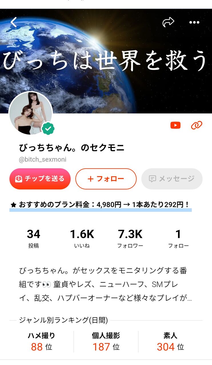 以前は、YouTubeチャンネル「びっちちゃん。」(同16万人)で、“経験人数100人超”の「しろ」、発起人の男性「てとぅ」とともに3人で活動していました。しかし今年1月、「方向性の違い」を理由に脱退し、現在は個人で活動しています。