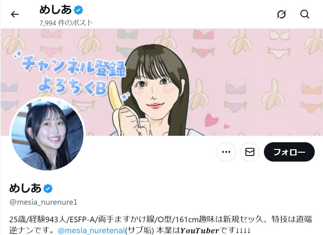 めしあは、“経験人数900人超”を公表しているアダルト系女性YouTuberです。「女性がもっと性にオープンになれる」ことを目指し、性に関する赤裸々な情報を発信しています。