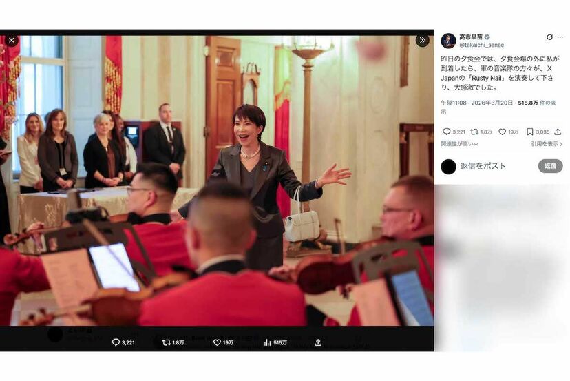 とはいえ、高市首相は何も理由なくはしゃいだわけではなさそうだ。首相は自身のX(旧ツイッター)で、《昨日の夕食会では、夕食会場の外に私が到着したら、軍の音楽隊の方々が、X Japanの「Rusty Nail」を演奏して下さり、大感激でした》と、大ファンであるアーティストの楽曲演奏に感動したことを投稿。演奏する曲はトランプ氏がすべて選んだそうで、この話をベッセント財務長官から聞いたという赤沢亮正経産相も、Xに《こんなおもてなしを目の当たりにして心が動かされない訳ないよね》と綴っている。
