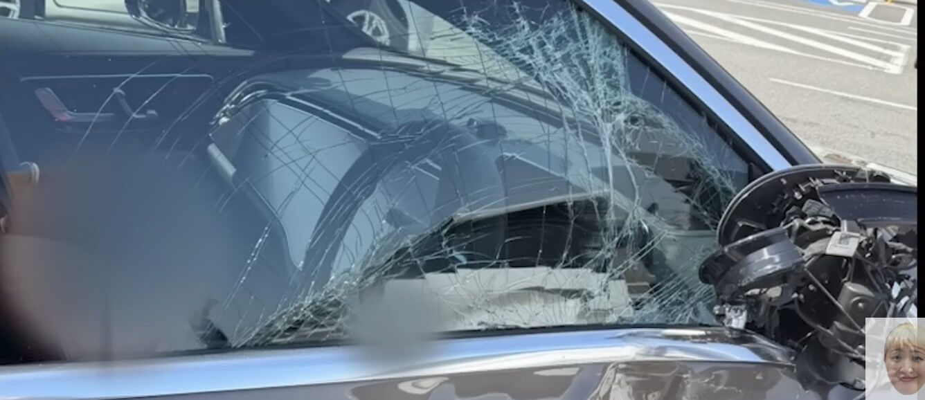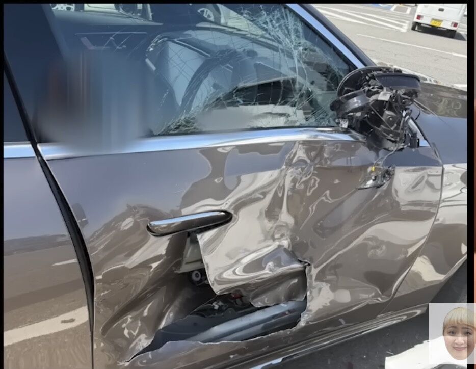 動画では運転席側が激しく破損した愛車の写真も公開。「ボコボコに、ボコボコ?。バリンバリンになってて」。本並氏は「出ようかなと思って、顔上げた瞬間に横っつらからフルスピードでバックで入って来て」と降車しようとしたタイミングでの事故だったと回顧し、事故直後の現場の写真も公開。丸山が「降りてたら挟まれて*でたって言われたんでしょ?」と促すと本並氏は「ここには居なかったです」と応じた。