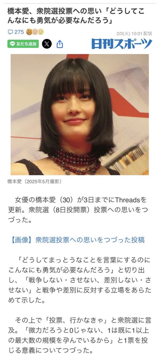 | 橋本愛、衆院選投票への思い「どうしてこんなにも勇気が必要なんだろう」(日刊スポーツ) - Yahoo!ニュース 橋本愛、衆院選投票への思い「どうしてこんなにも勇気が必要なんだろう」(日刊スポーツ) Yahoo!ニュース (出典:Yahoo!ニュース) |