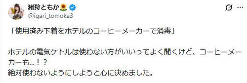34歳アイドルの猪狩ともかが、米女性インフルエンサーのコーヒーメーカーで下着を消毒するライフハックを批判。ホテルの器具使用に関する注意喚起を促した。